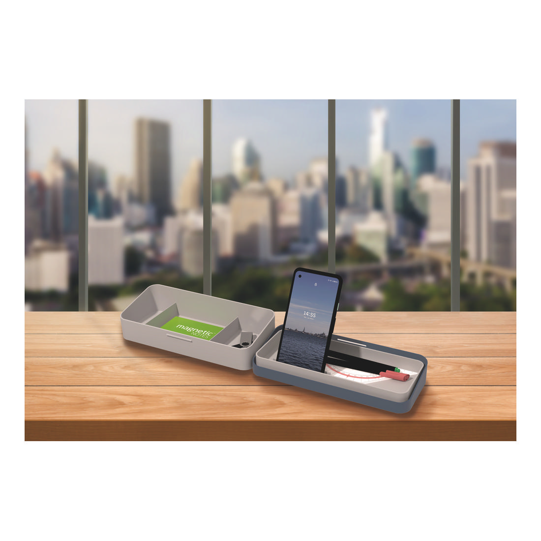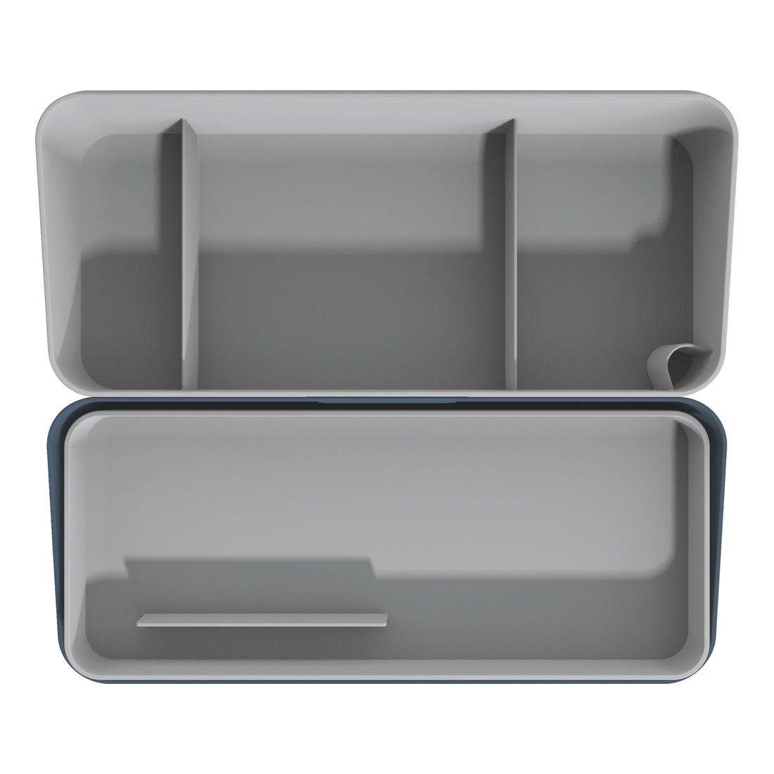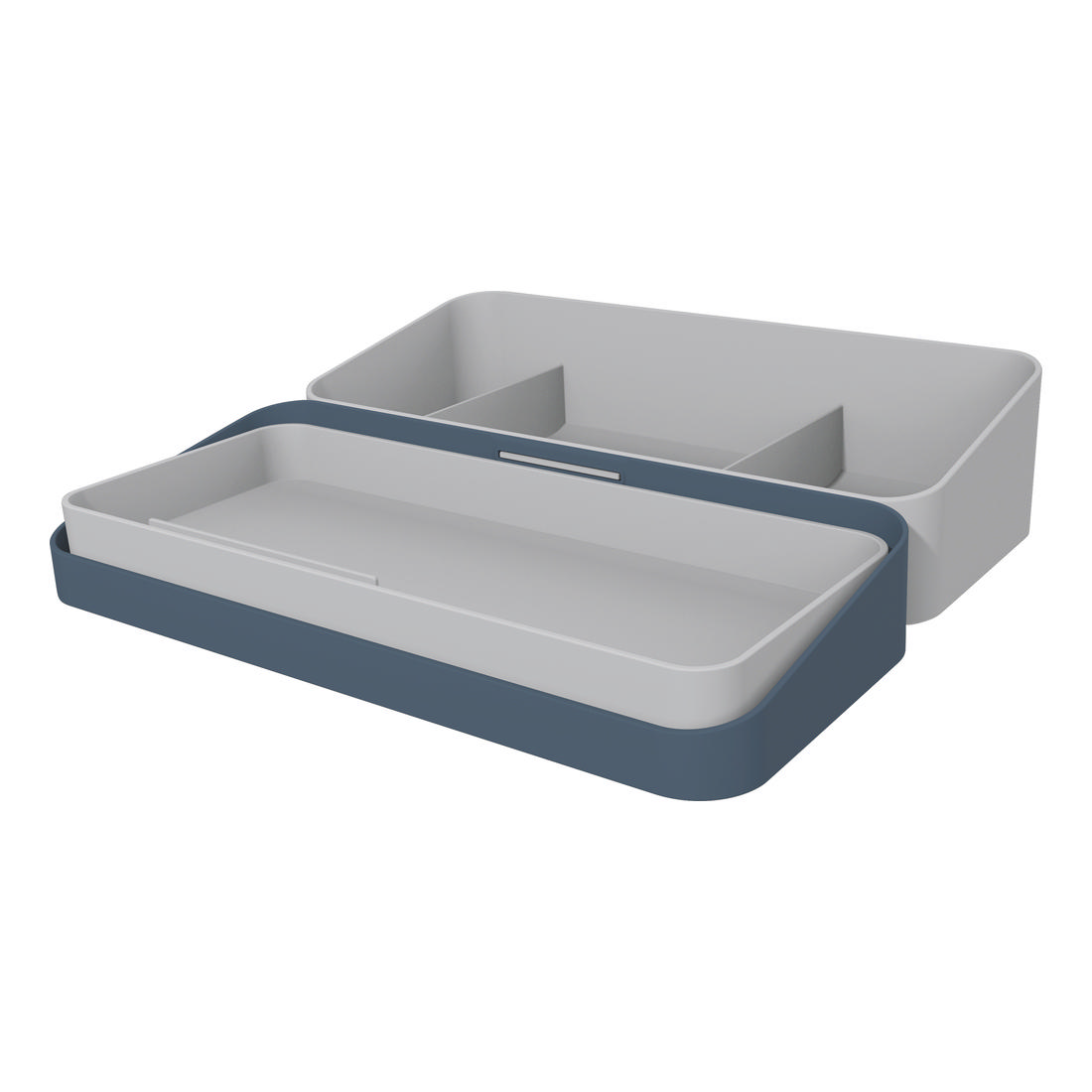 The desk organiser guarantees the highest standards of environmental, health and utility properties. The product is made of recycled plastic (at least 80% post-consumer material), is certified with the environmental label "Blauer Engel" and is ideal for constantly changing workplaces (office, home office, co-working spaces). The stackable product consists of three parts, a removable lid with a snap lock, a removable pen tray with an integrated mobile phone holder and a lower part with a pen holder and three compartments in different sizes for e.g. sticky notes and small parts. All three parts can be nested to save space.