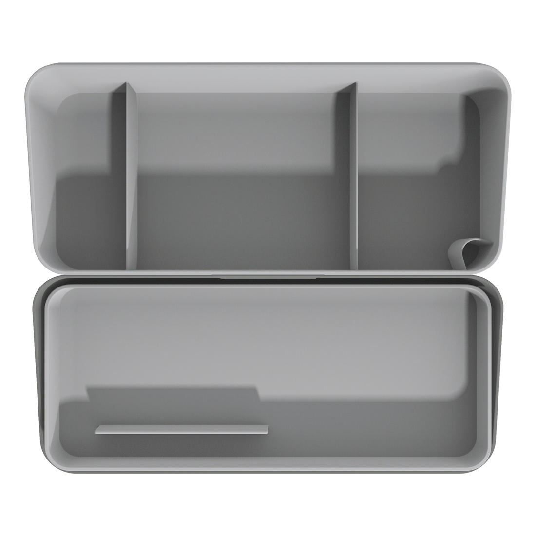 The desk organiser guarantees the highest standards of environmental, health and utility properties. The product is made of recycled plastic (at least 80% post-consumer material), is certified with the environmental label "Blauer Engel" and is ideal for constantly changing workplaces (office, home office, co-working spaces). The stackable product consists of three parts, a removable lid with a snap lock, a removable pen tray with an integrated mobile phone holder and a lower part with a pen holder and three compartments in different sizes for e.g. sticky notes and small parts. All three parts can be nested to save space.