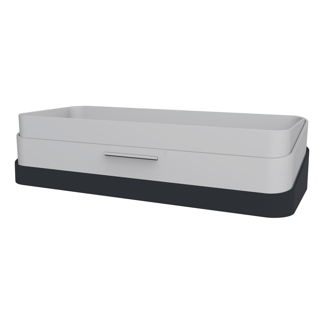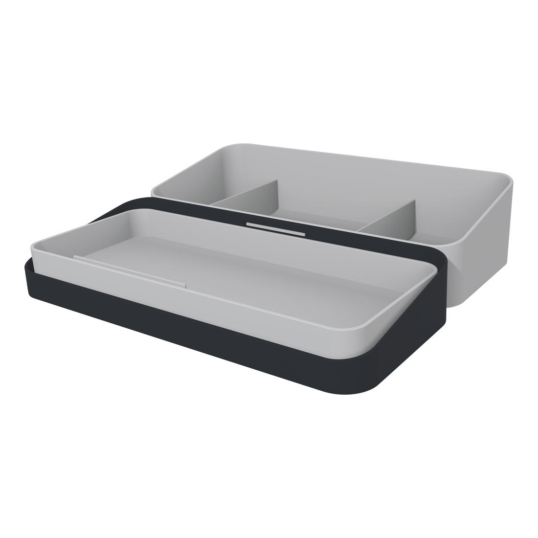 The desk organiser guarantees the highest standards of environmental, health and utility properties. The product is made of recycled plastic (at least 80% post-consumer material), is certified with the environmental label "Blauer Engel" and is ideal for constantly changing workplaces (office, home office, co-working spaces). The stackable product consists of three parts, a removable lid with a snap lock, a removable pen tray with an integrated mobile phone holder and a lower part with a pen holder and three compartments in different sizes for e.g. sticky notes and small parts. All three parts can be nested to save space.