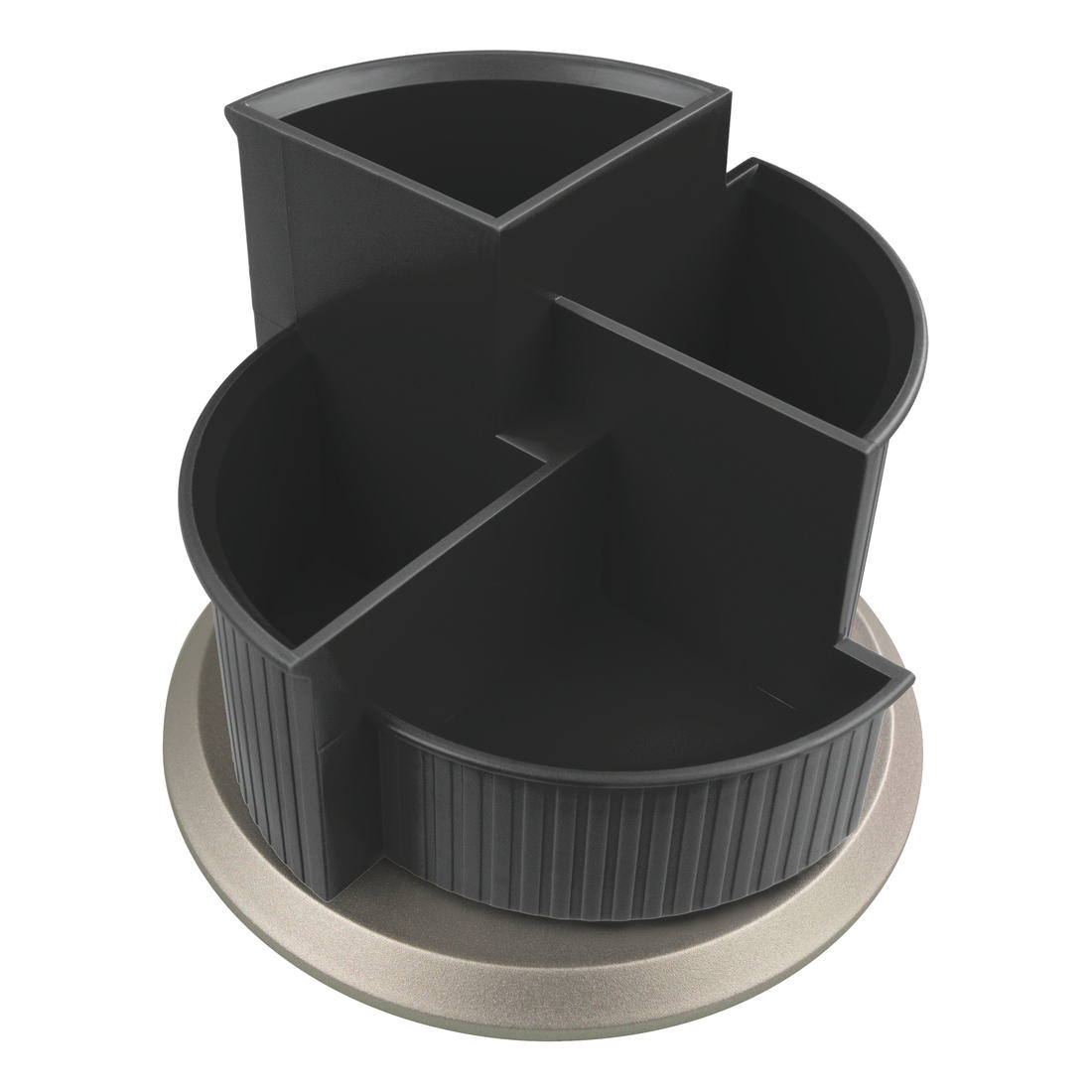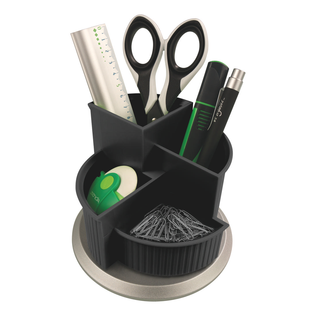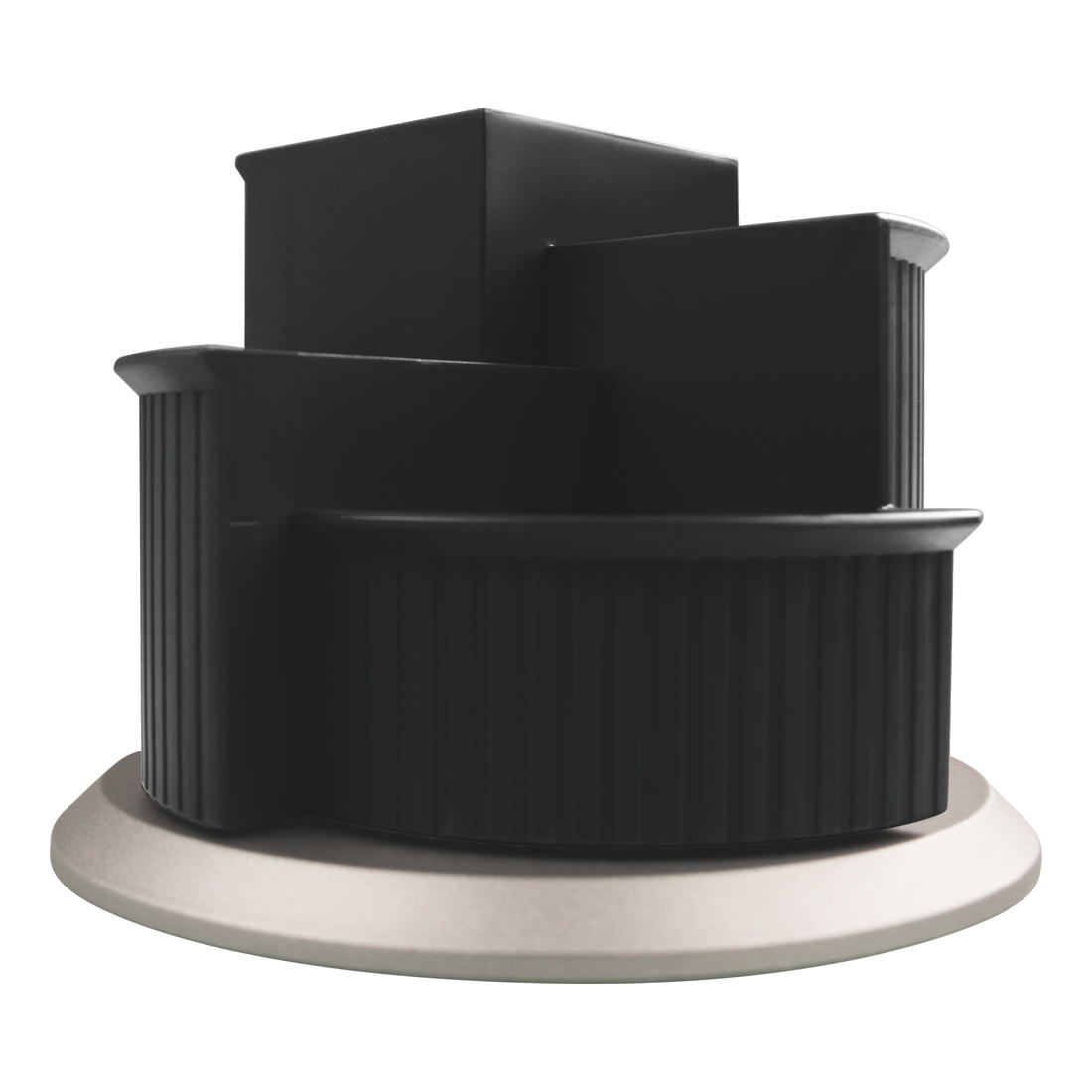 The rotating multi pen holder is made of opaque and matt material and ensures a tidy desk. The product consists of a black holder with an elegant stripe design that rotates on a silver removable base. It has three large compartments for pens, scissors or rulers and one compartment for small items like paper clips or thumbtacks. The integrated non-slip rubber pads protects against slipping.