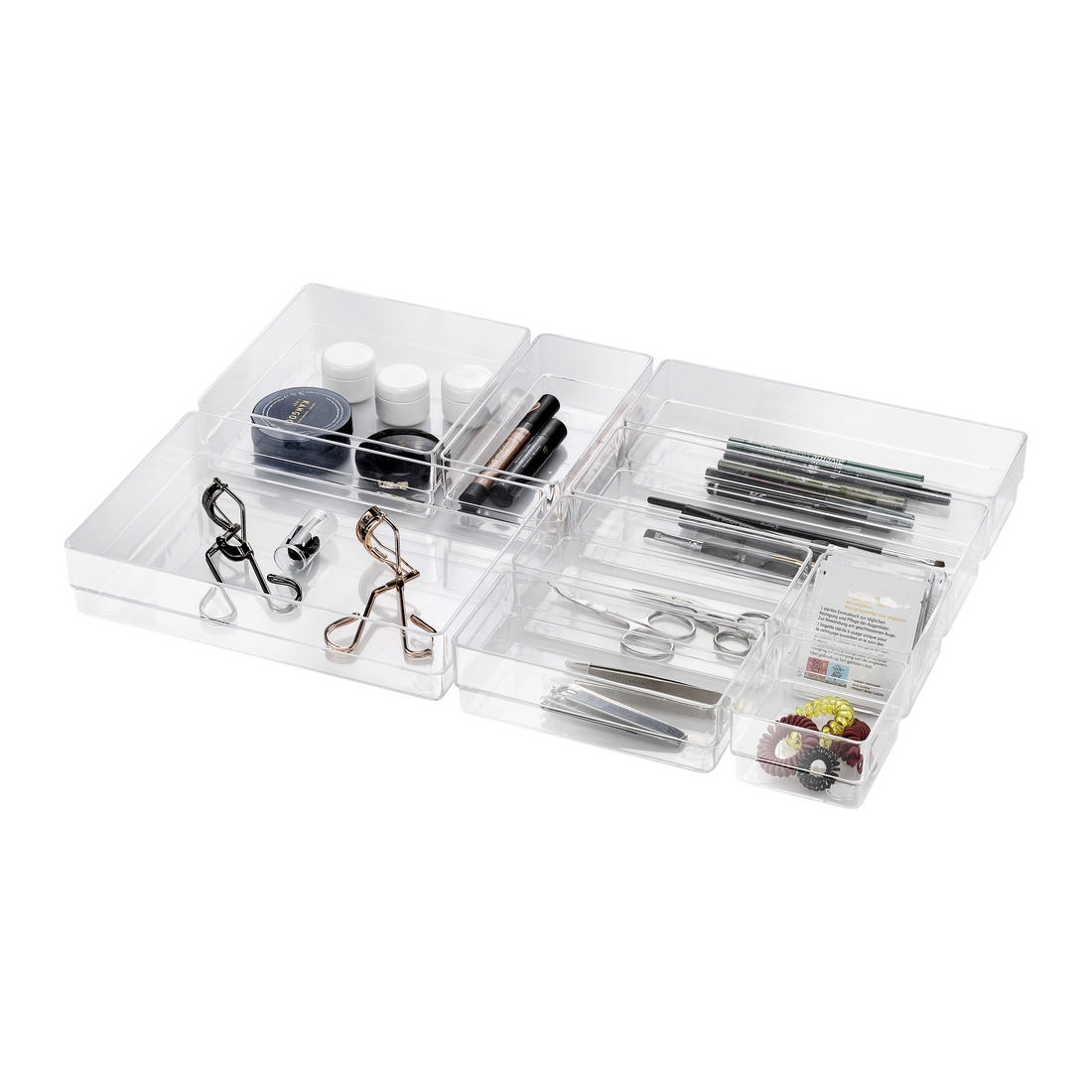 Discover the perfect solution for your drawers, the helit 13-piece, transparent drawer organiser, „the organiser“! With five different sizes and silicone pads to prevent slipping, your drawer will never be chaotic again. The helit „the organiser“ offers maximum flexibility in organizing your items. Whether it‘s cutlery, office supplies, cosmetics, or other small utensils - with the various sizes, you can store everything neatly and efficiently. The transparent design allows you to instantly see what‘s in each drawer without having to search for a long time. This not only saves time but also reduces frustration! Practical silicone pads on the bottom of the compartments prevent slipping when opening and closing the drawer.The “the organiser” from helit is made of high-quality, transparent material and is stackable to create even more space in your drawers. Put an end to the chaos in your drawers and bring order to your home and office!