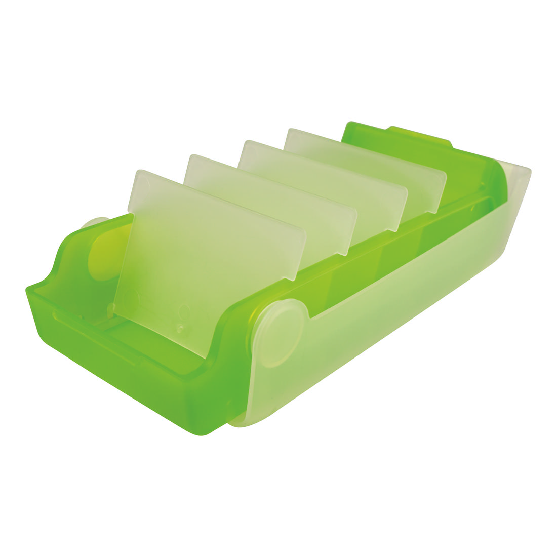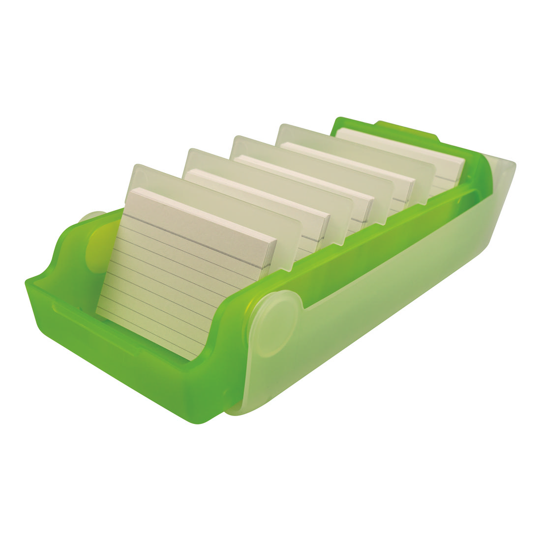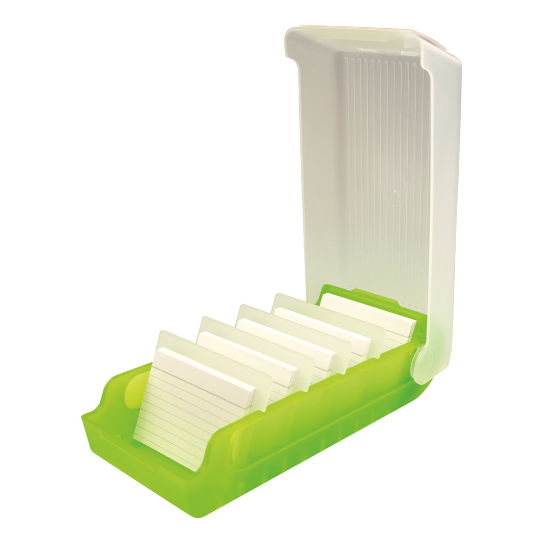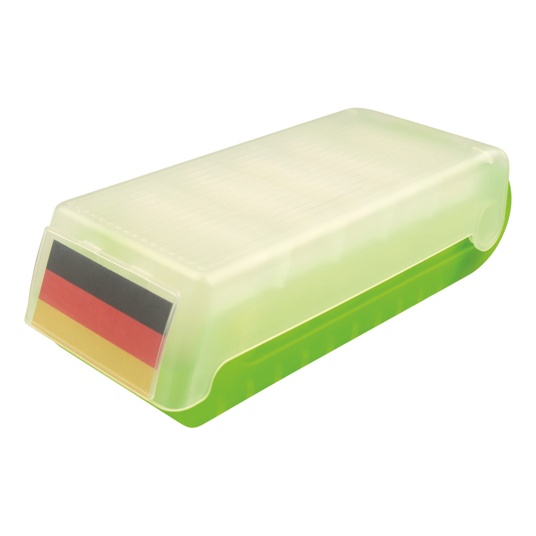 The learning card storage box for the A8 cards (landscape) is made of an translucent plastic and has four dividers for up to five variably adjustable compartments. The product comes with 100 lined index cards and has an integrated sign with country flags. the lid is removable and can be pushed under the for continuous use, so that the cards are exposed. Up to 800 cards can be storred on the product. The box can be used for storing notes, as well as for learning vocabulary or other learning content.