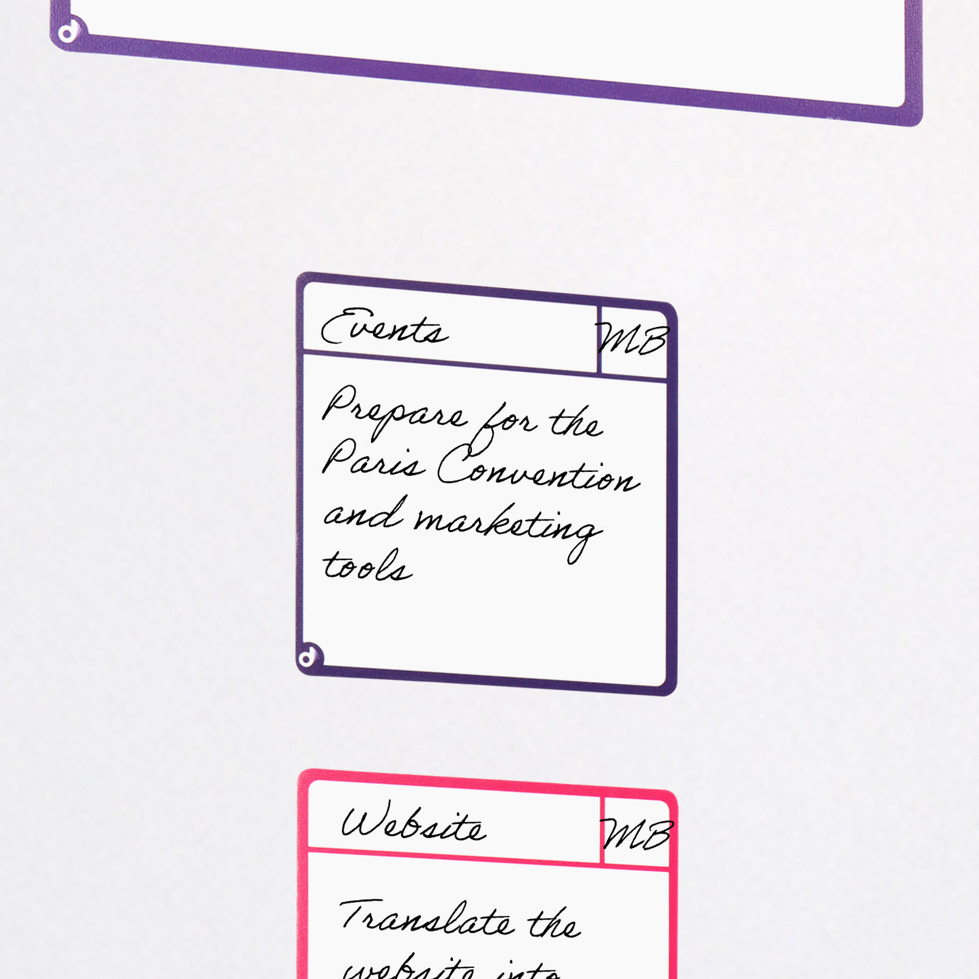 - Use these cards to write individual tasks for team members and create very visual physical task management boards for project management or product development.