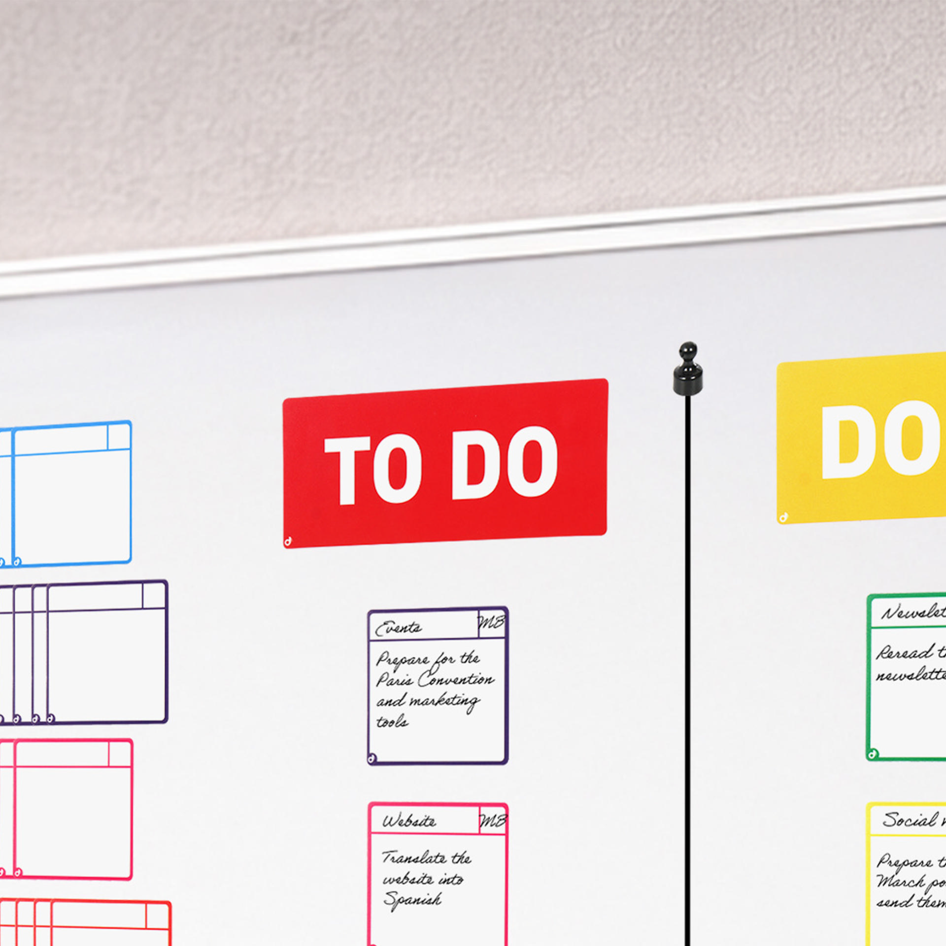 Task management is an essential component of project management and product development. At Djois we’ve developed a set of physical task management tools to help teams create very visual and physical task boards adapted to their needs. The tools we propose include comprehensive magnetic solutions to set up project boards on any whiteboard or metal surface. Here are our ready-to-use preprinted Scrum title column cards. Let us help you create the ideal Scrum task management board!