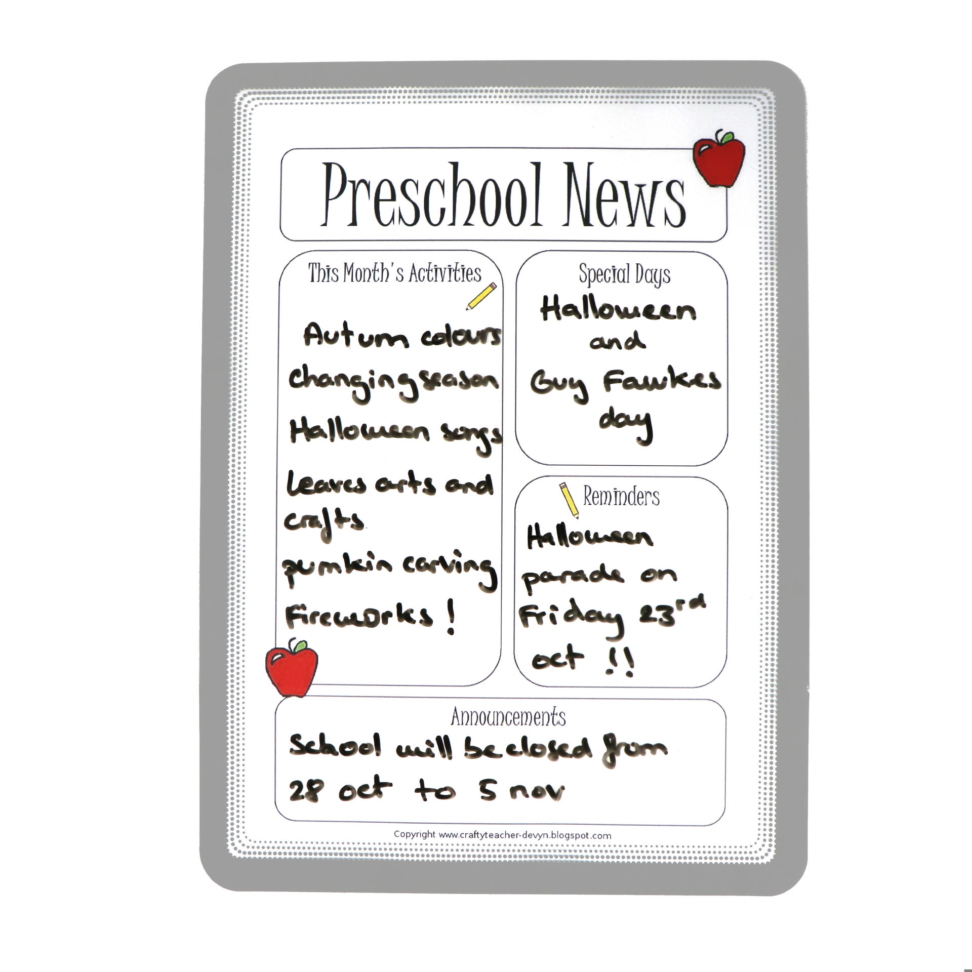 - Ideal for checklists, weekly information updates, monthly themes, presence sheets, weekly menus, daily lists, etc.