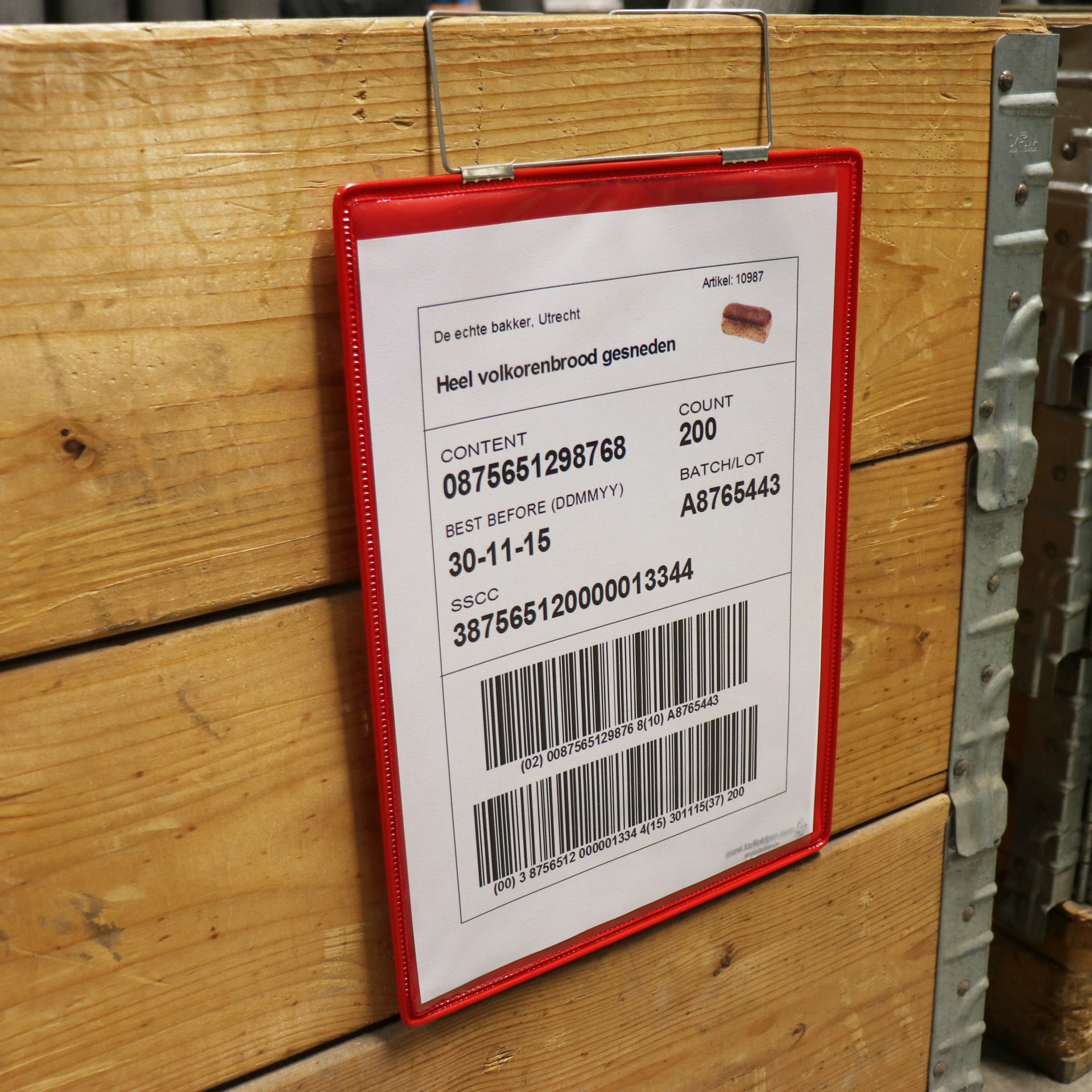 Reinforced identification pocket to hang for a precise, visible and durable identification of all stored goods or goods circulating in the logistic chain.