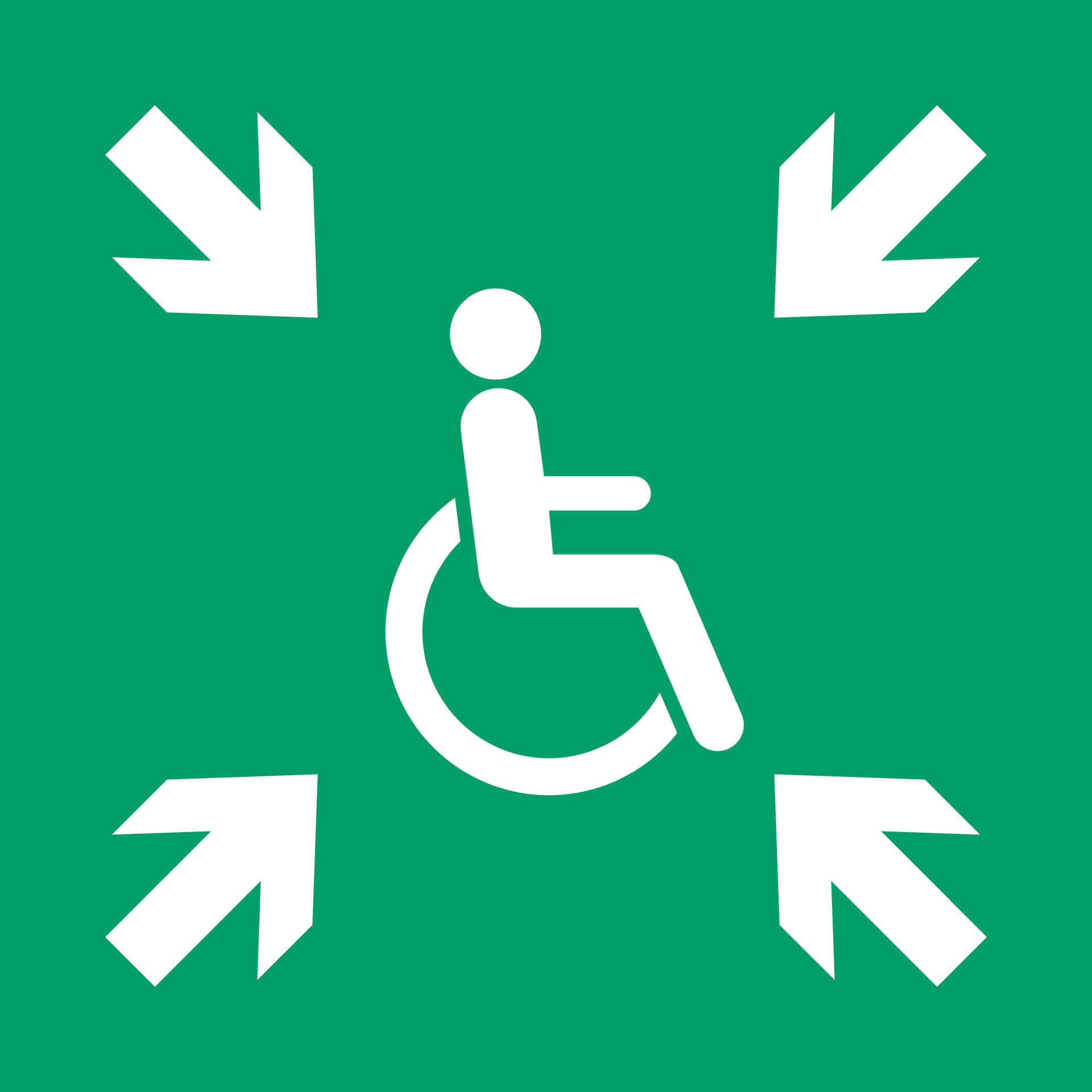 Easy to mount plastic sign to indicate the location of a temporarily safe area to wait there for assistance. This meeting point is intended for those who cannot use stairs in case of an evacuation.